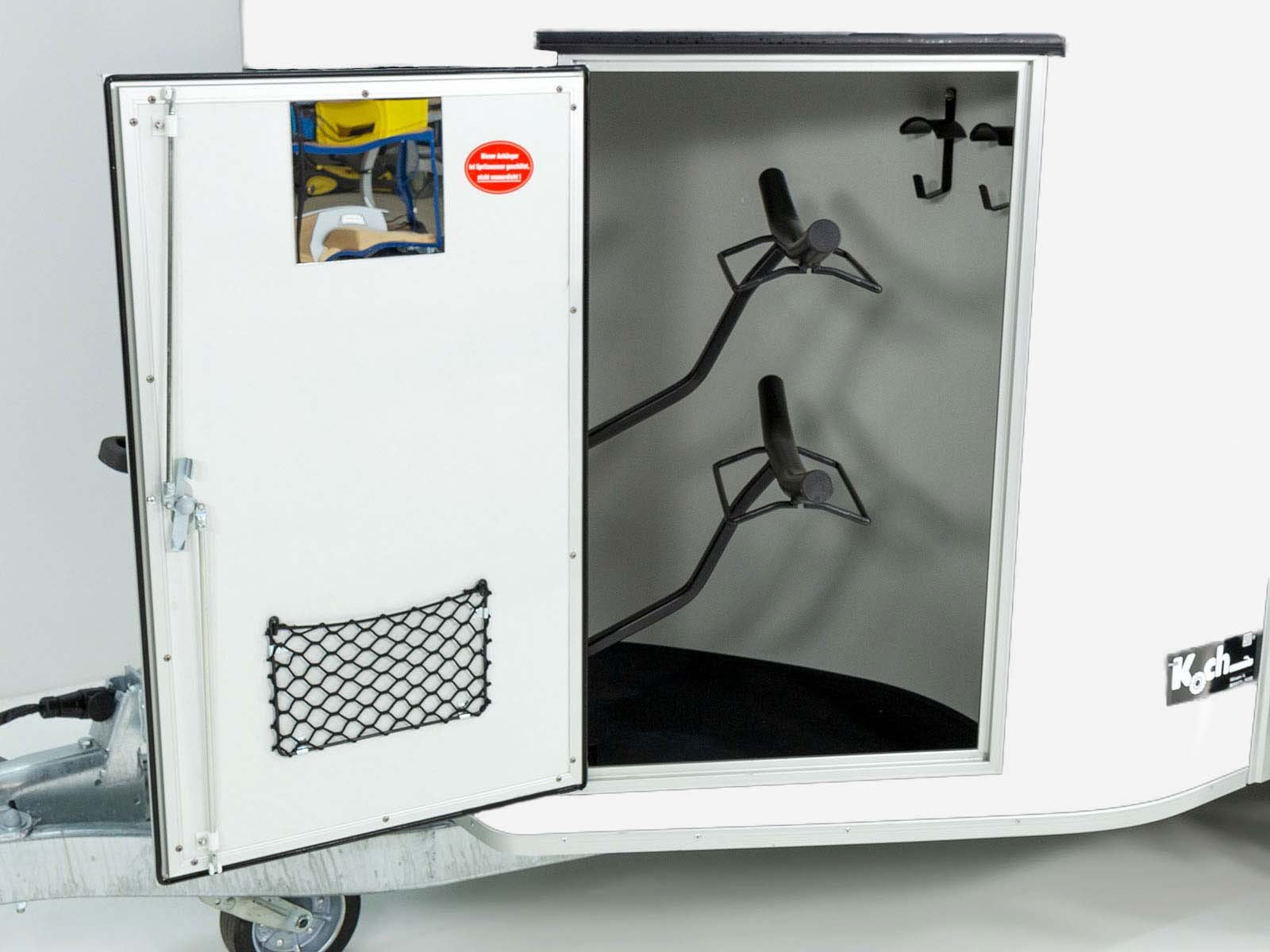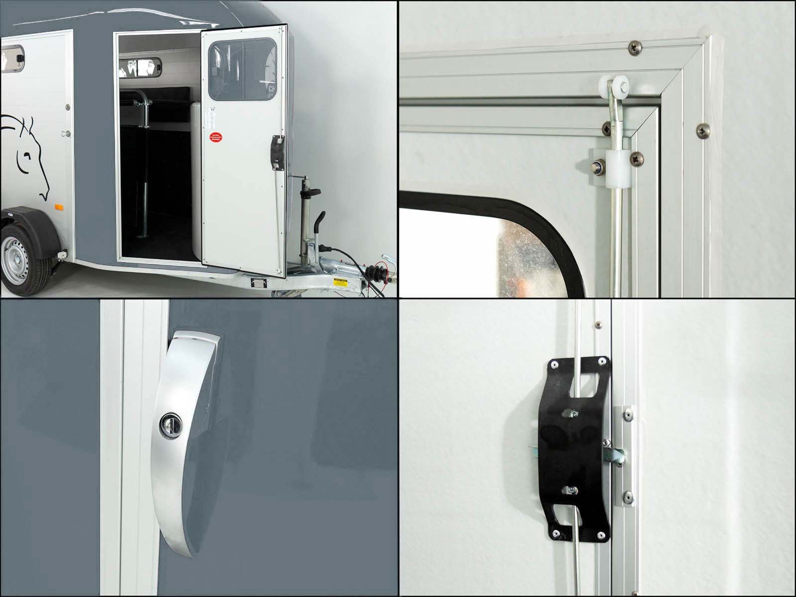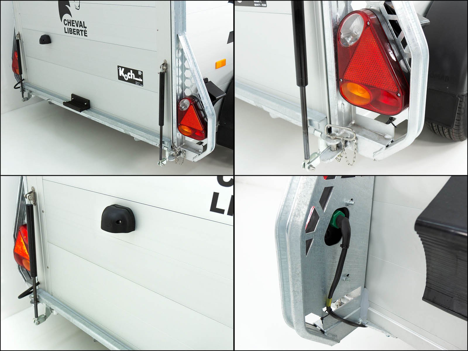 - Porta traseira em alumínio, giratória e articulável com revestimento de borracha