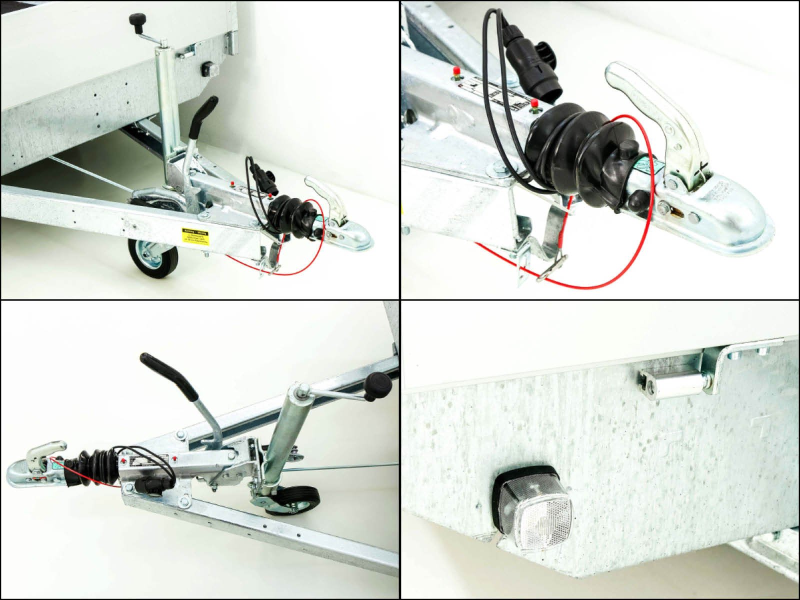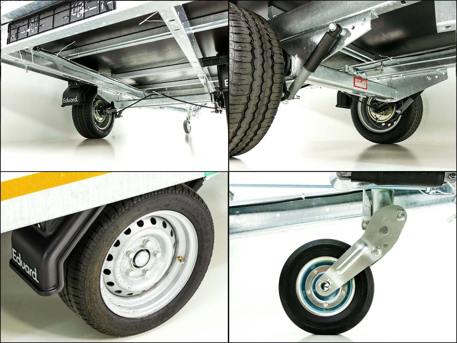 O reboque de carga alta Edward 2615 GE com uma lona alta adicional oferece uma solução de transporte confortável para cargas maiores. A área de carga de 150×256 cm e o peso total permitido de 1,35 toneladas tornam-no ideal para cargas médias a pesadas. A estrutura de aço galvanizado a quente garante durabilidade, enquanto as paredes laterais de alumínio (300 mm de altura), dobráveis e removíveis, oferecem flexibilidade na carga e descarga. O reboque está equipado com uma prática lona alta (160 cm) que protege contra os efeitos das intempéries. Outras características incluem sistema de reversão automática, volante jockey automático e homologação de 100 km/h (opcional).