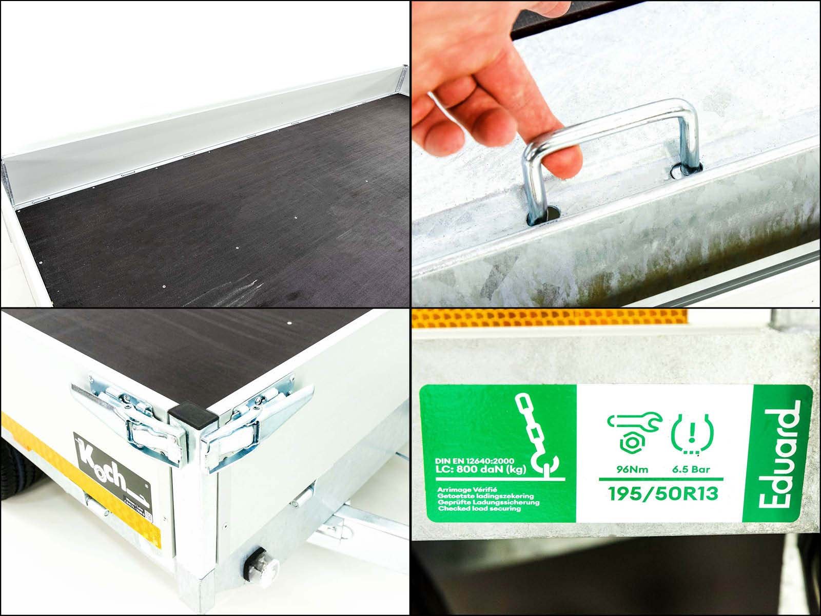O reboque de carga alta Edward 4018 GD oferece uma área de carga generosa de 180×406 cm e um peso total permitido de 2,7 toneladas. Com um peso vazio de aproximadamente 543 kg e uma carga útil de até 2.157 kg, é ideal para tarefas de transporte médias a pesadas. Equipado com estrutura em aço galvanizado a quente, paredes laterais removíveis em alumínio (300 mm de altura) e 16 olhais de fixação (800 daN) na estrutura do piso, este reboque garante elevada estabilidade e fixação segura da carga. O eixo de suspensão de borracha e a roda de apoio automático oferecem um elevado nível de conforto de condução e fácil manobrabilidade. O reboque está equipado com sistema de reversão automática e pode ser fornecido com homologação de 100 km/h mediante solicitação.