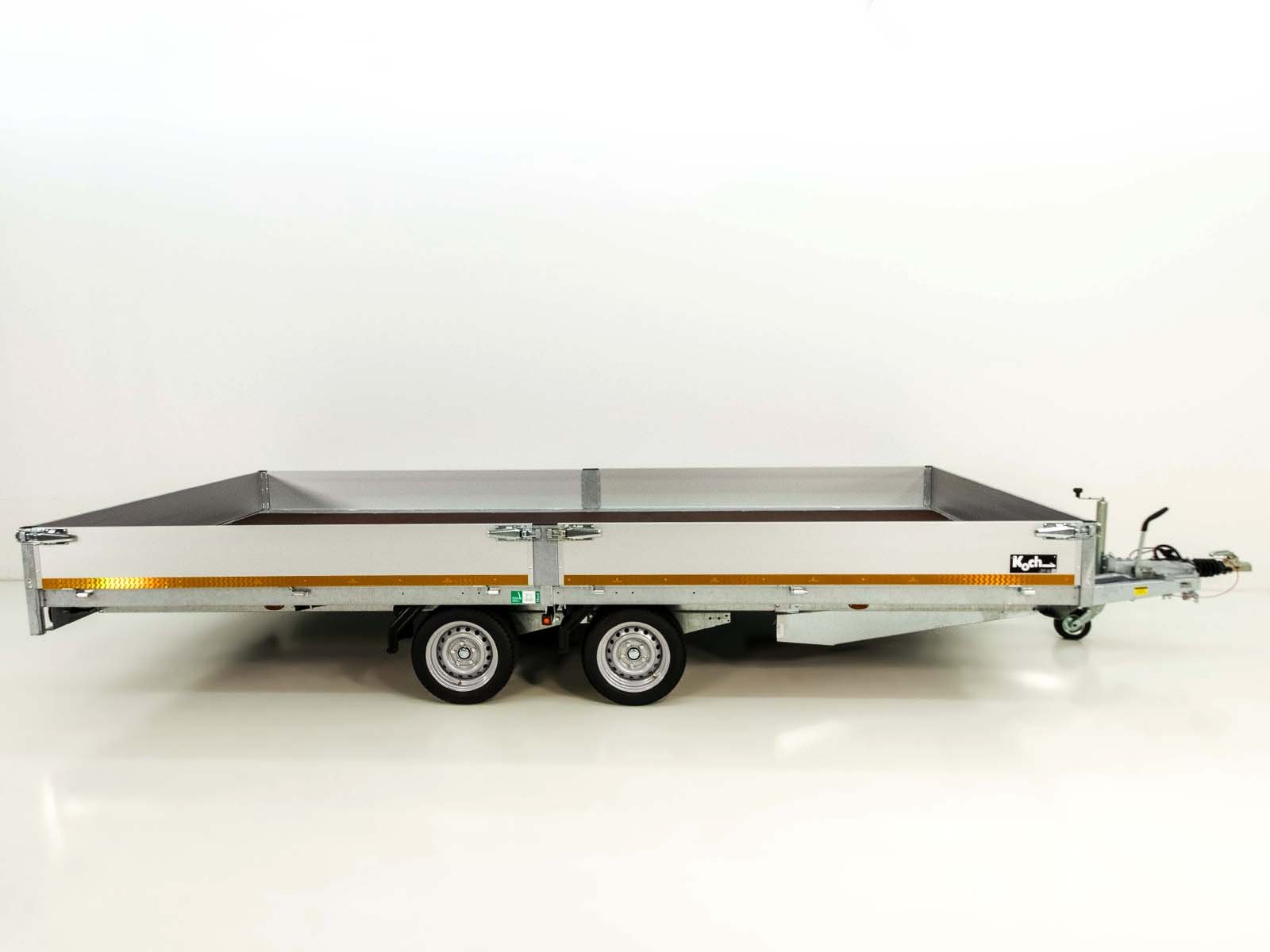 O reboque de carga alta Edward 5022 GD com um espaço de carga de 220×506 cm e um peso total permitido de 3,5 t oferece uma carga útil de aproximadamente 2.762 kg. Está equipado com paredes laterais de alumínio removíveis (300 mm de altura) e possui 20 olhais de fixação no perfil da estrutura do piso para uma fixação segura da carga. A estrutura de aço galvanizado a quente garante uma longa vida útil e o volante automático facilita o manuseio.