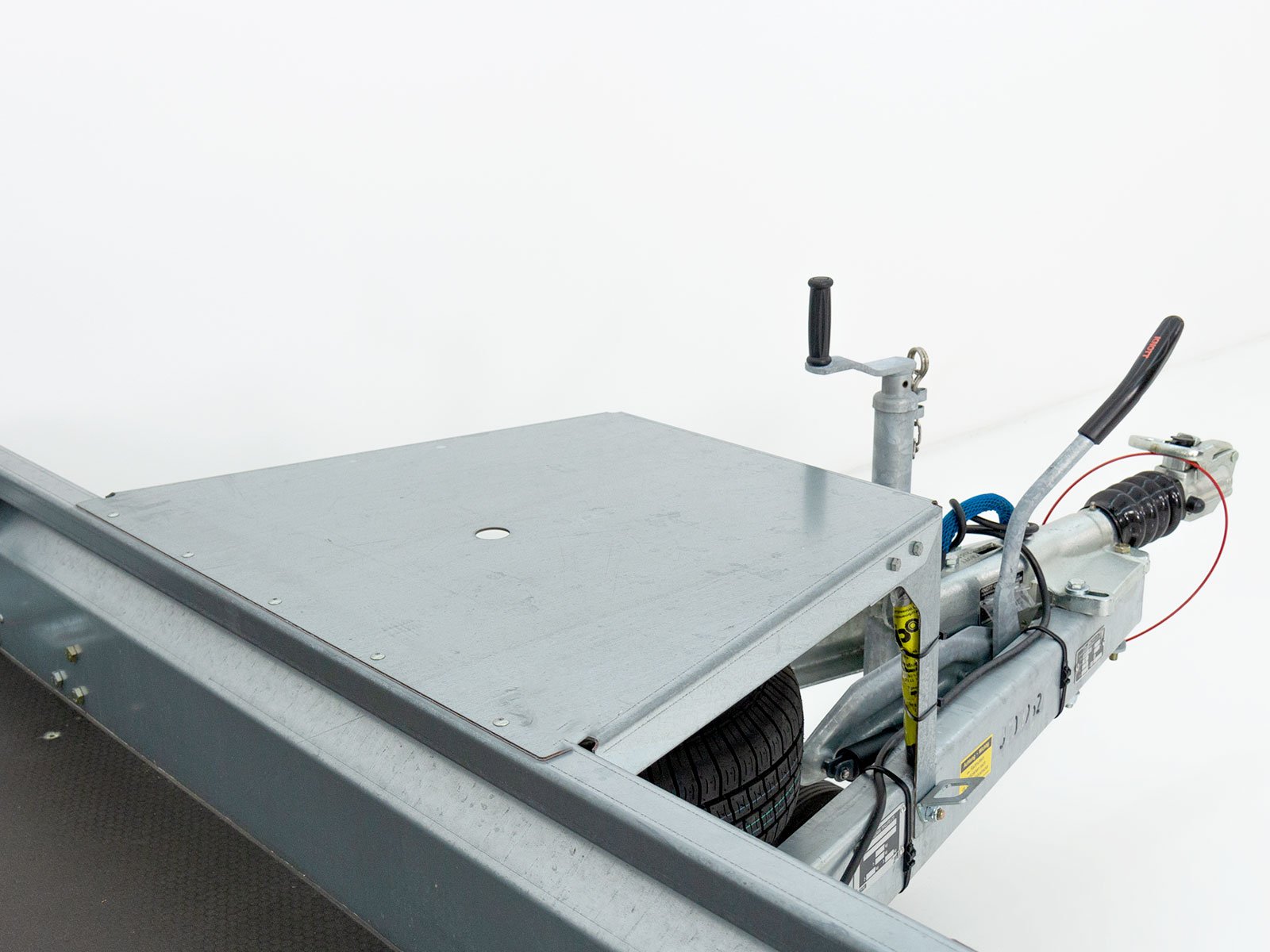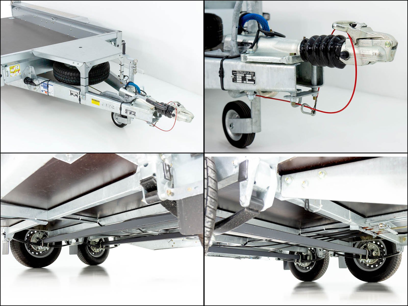 - Chassis: Molas de lâmina, barra de tração em V com acoplamento esférico, roda de suporte para serviço pesado