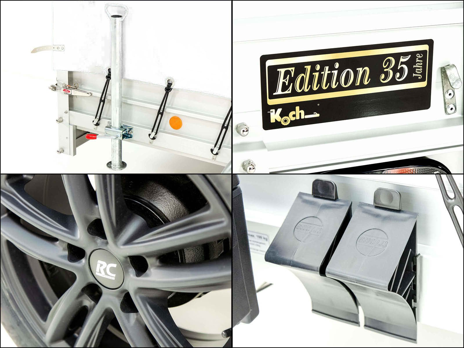 O reboque Koch ‘Edition 35’ na cor branca com uma lona de 160 cm de altura oferece um design moderno e uma elevada capacidade de carga. O reboque de piso plano com construção em alumínio de alta qualidade é ideal para usuários que procuram um reboque robusto e flexível. Este trailer também está disponível em 10 cores de lona diferentes.