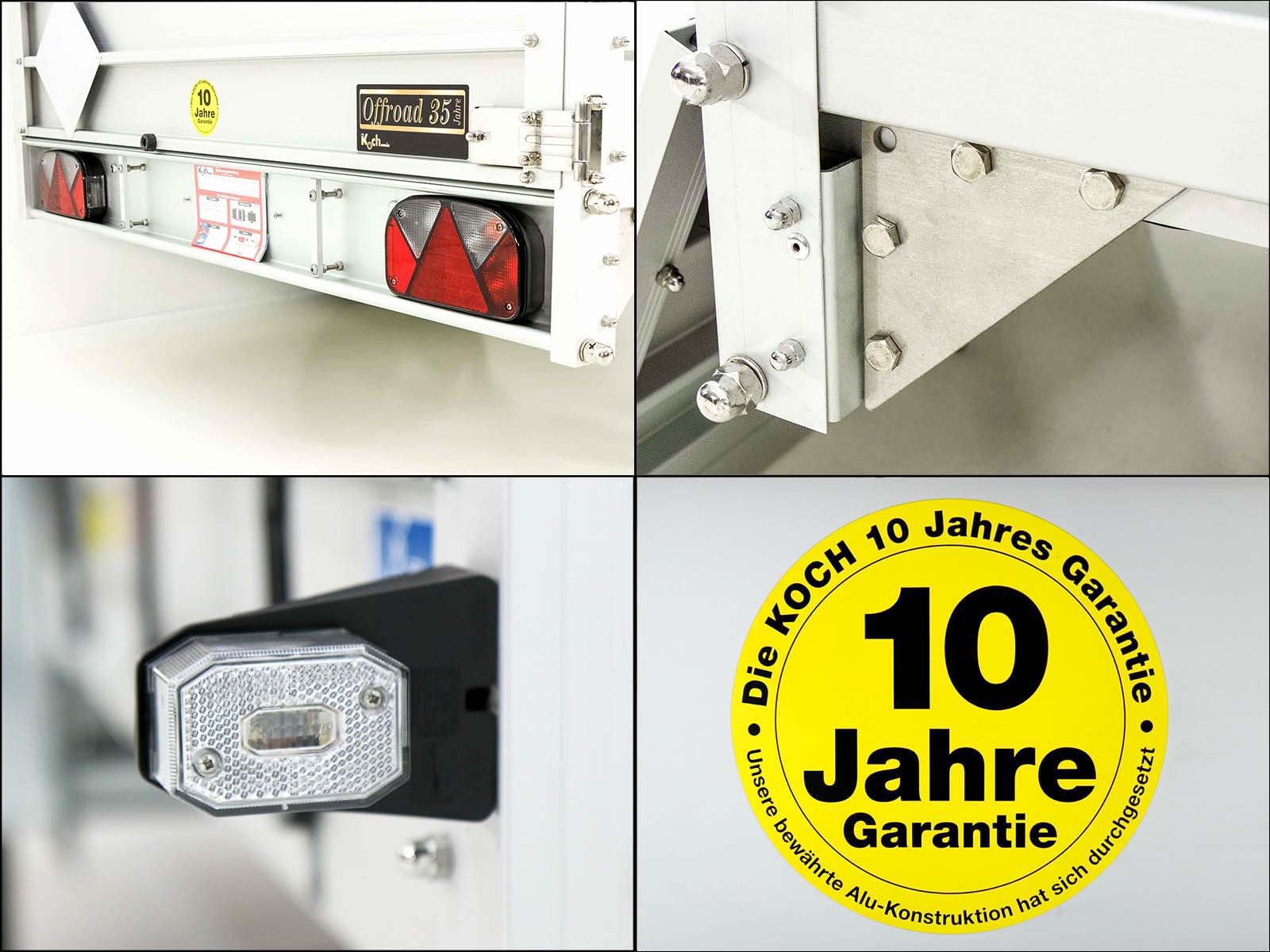 O reboque Koch tipo 7.13 em laranja também oferece uma carga útil de 1.020 kg e um peso total permitido de 1.300 kg. Este reboque caracteriza-se pela sua construção robusta, fixação segura da carga e longa vida útil. Os recursos pendentes incluem: