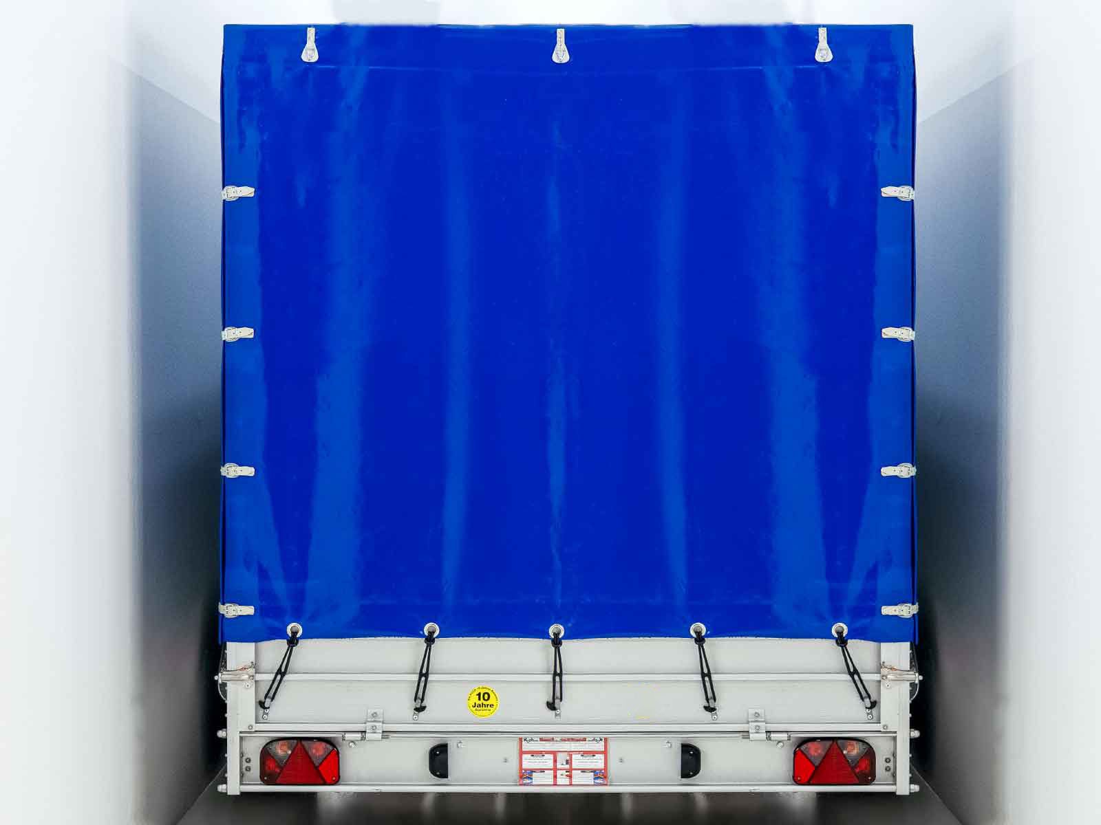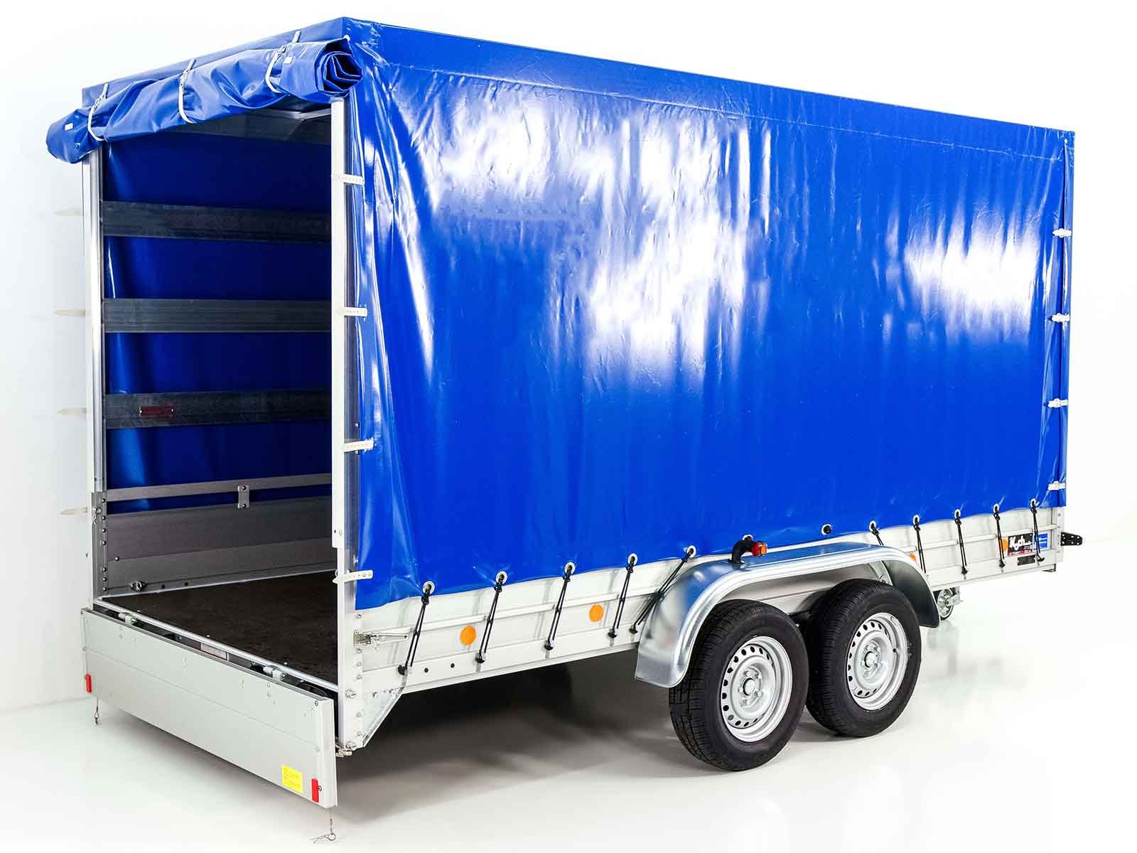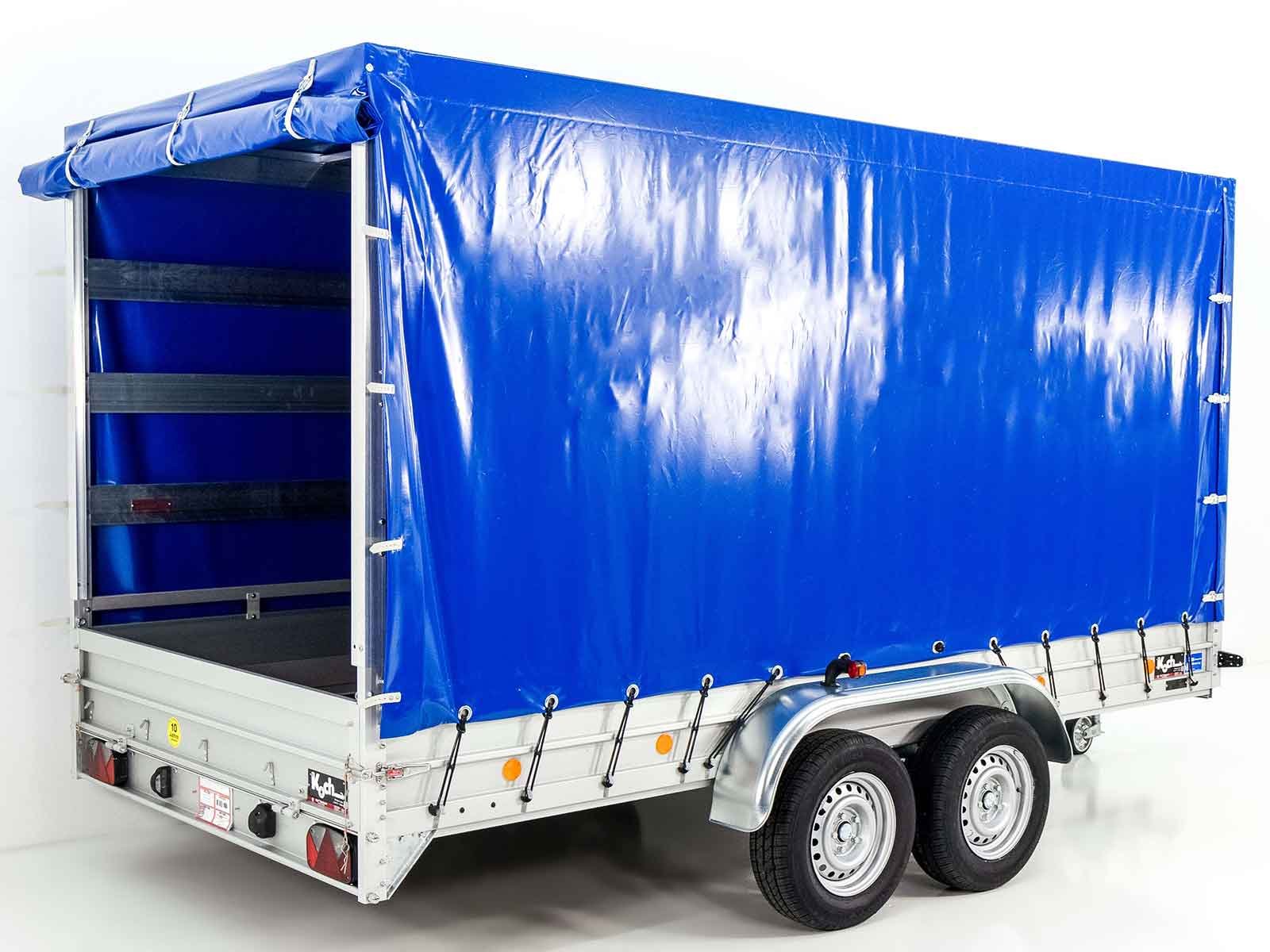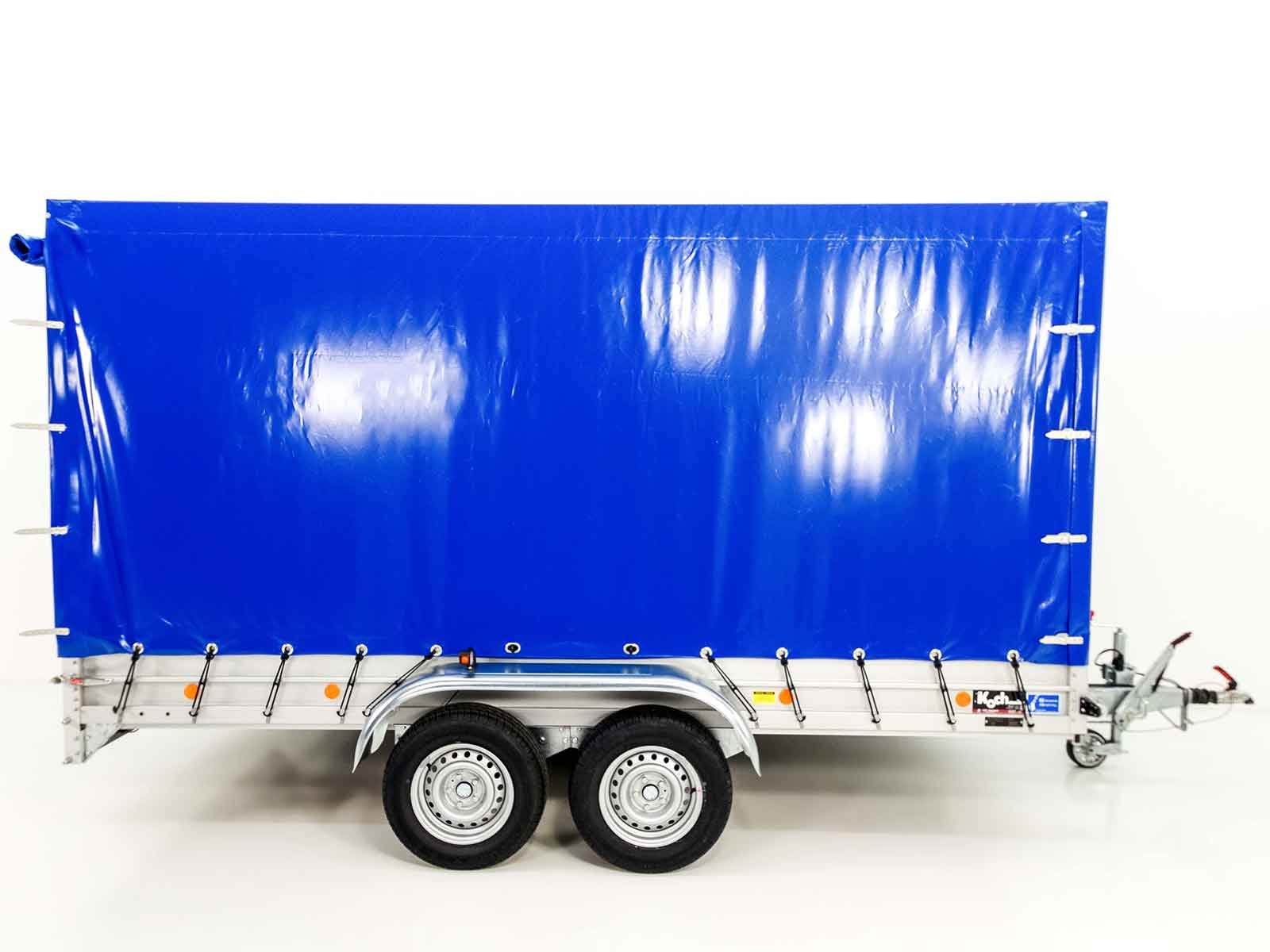 O reboque Koch tipo 10.26 com uma lona alta azul de 200 cm oferece excelente qualidade e uma carga útil elevada de 2090 kg com um peso total de 2600 kg. Ideal para transporte profissional, este reboque é: