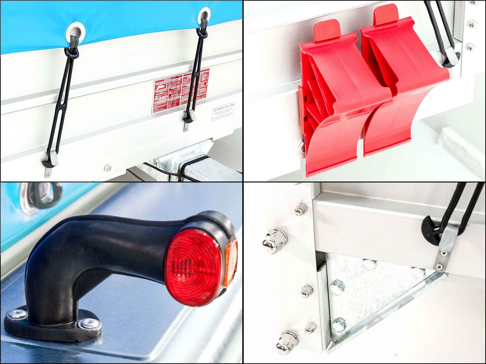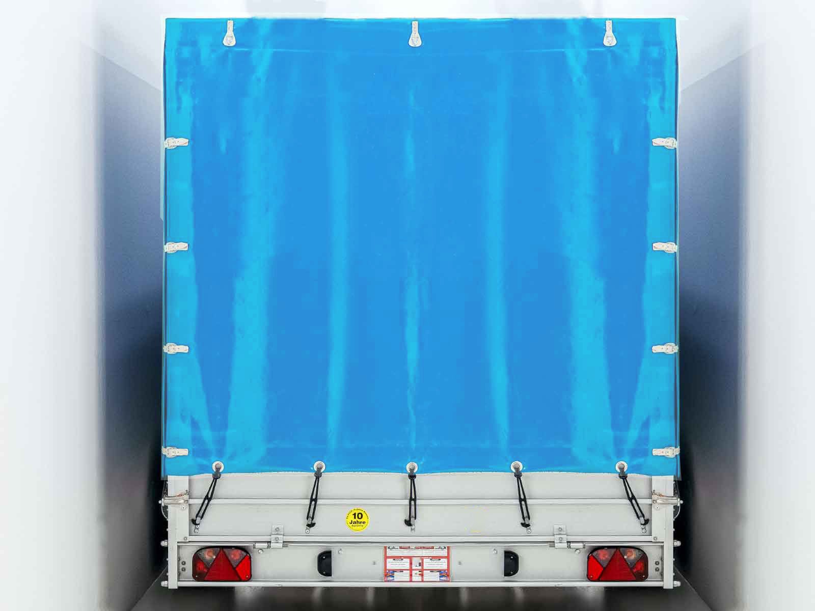O reboque Koch tipo 10.26 com lona alta de 200 cm em azul claro oferece um design de primeira classe com uma carga útil elevada de 2.090 kg e um peso total de 2.600 kg. O trailer é feito de alumínio leve e impressiona por: