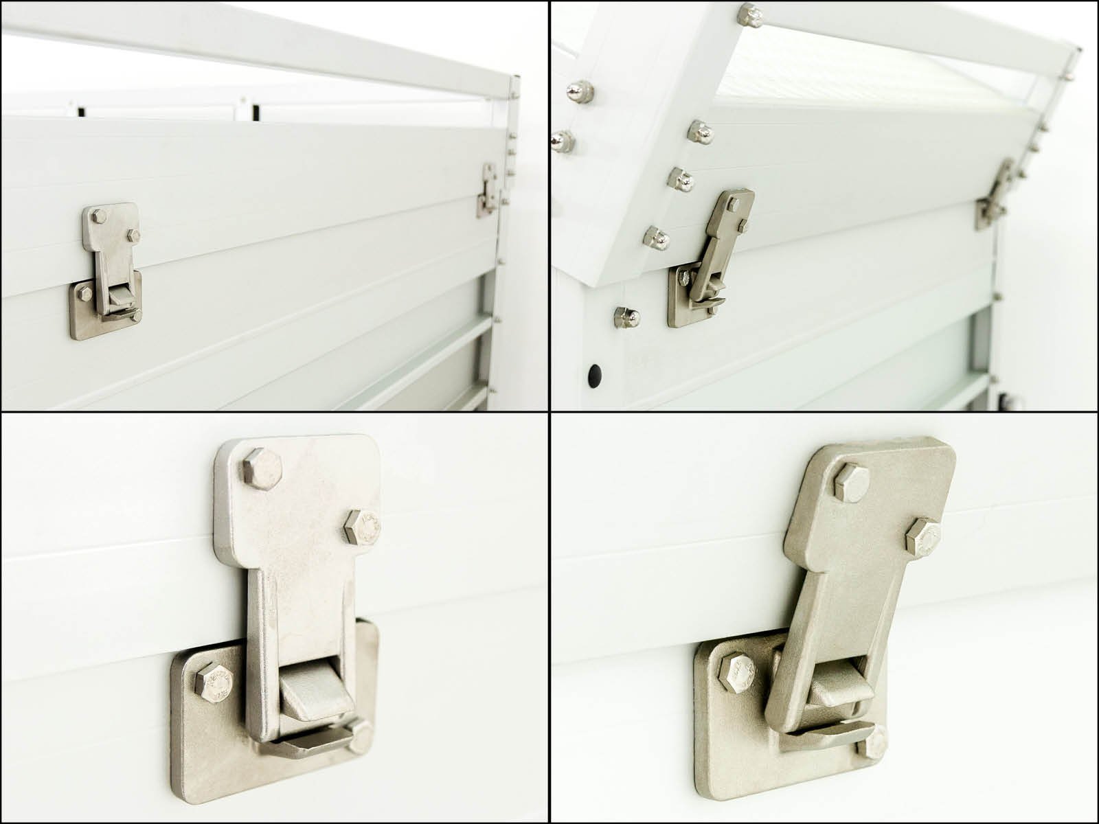 - Travas da porta traseira muito estáveis feitas de aço inoxidável V2A