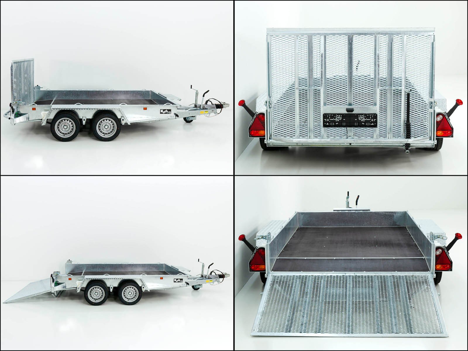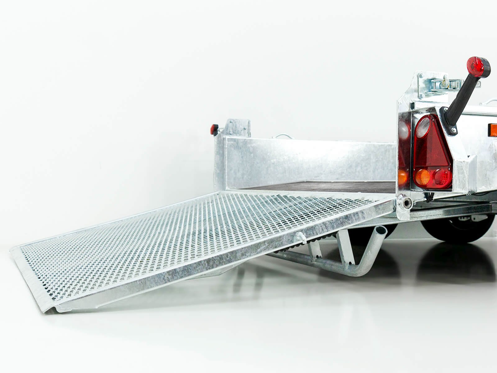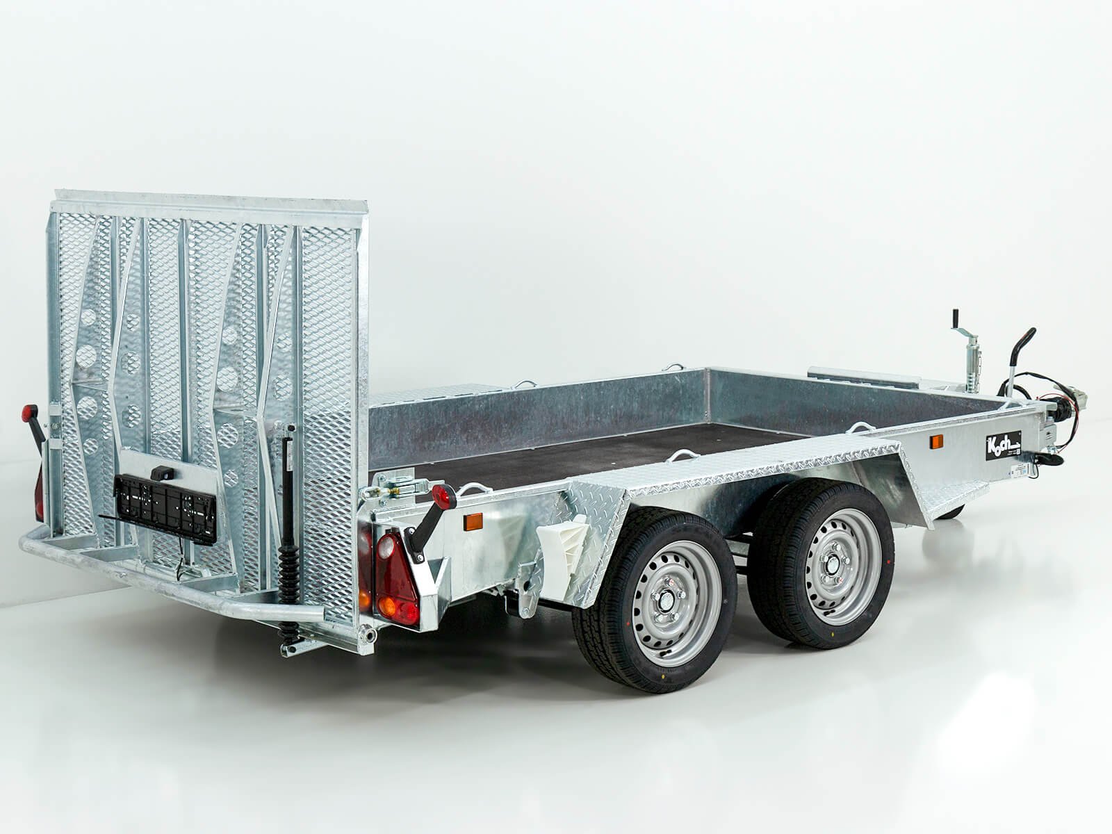 O ‘Reboque de máquinas de construção Variant Maxi Load 161×305 3.5t’ com rampa contínua é ideal para o transporte de máquinas e veículos de construção pesada. A rampa é particularmente estável e facilita a subida. A generosa carga útil de 2.869 kg garante alta resiliência.