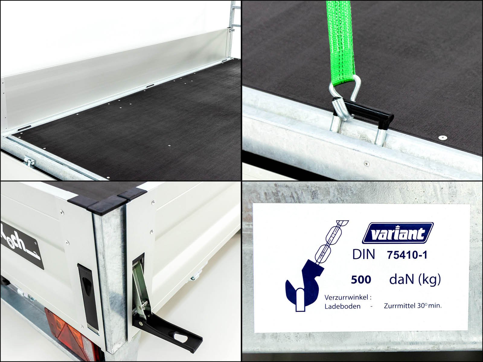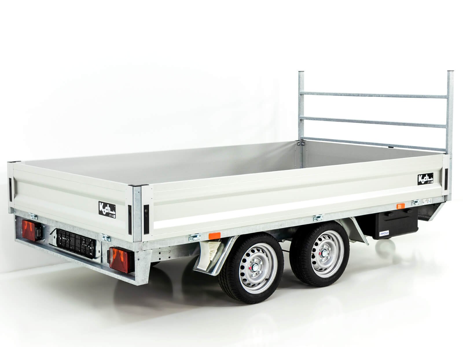 O reboque de carga alta Variant P3 3018 Comfort é um reboque flexível equipado com uma estrutura H e uma caixa de armazenamento. Com dimensão de carga de 175×315 cm e carga útil de 2.490 kg, oferece espaço suficiente para transporte médio-pesado. O reboque possui um painel de piso multiplex de madeira, que é resistente e durável, bem como paredes laterais de alumínio removíveis e 6 suportes de amarração para fixar a carga com segurança. O eixo de rampa permite a adaptação de rampas, o que torna o reboque particularmente útil para o transporte de veículos ou outras mercadorias de grande porte. Uma aprovação de 100 km/h está disponível como opção.