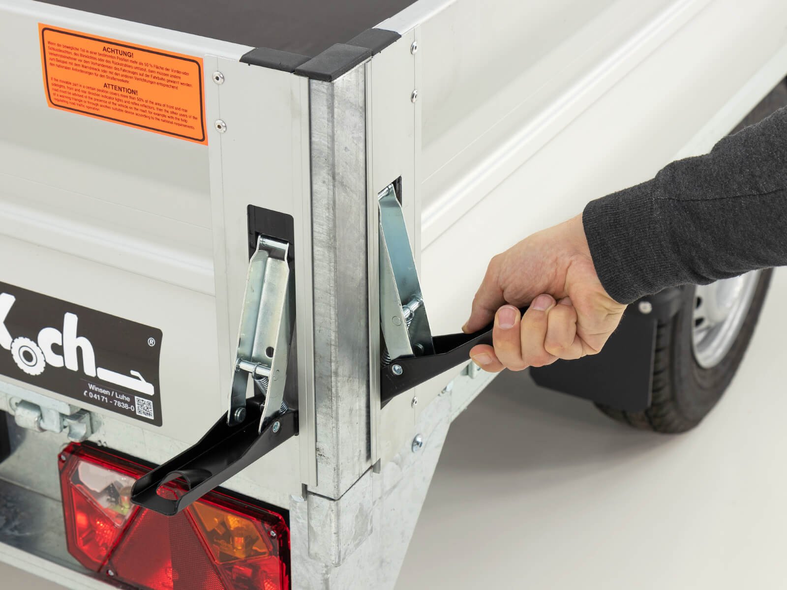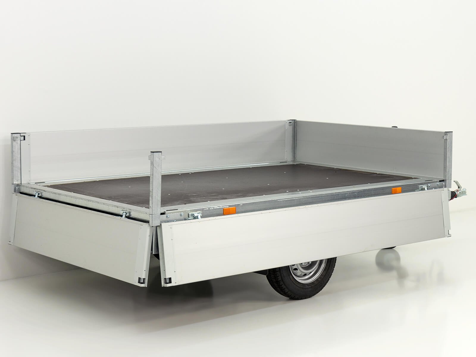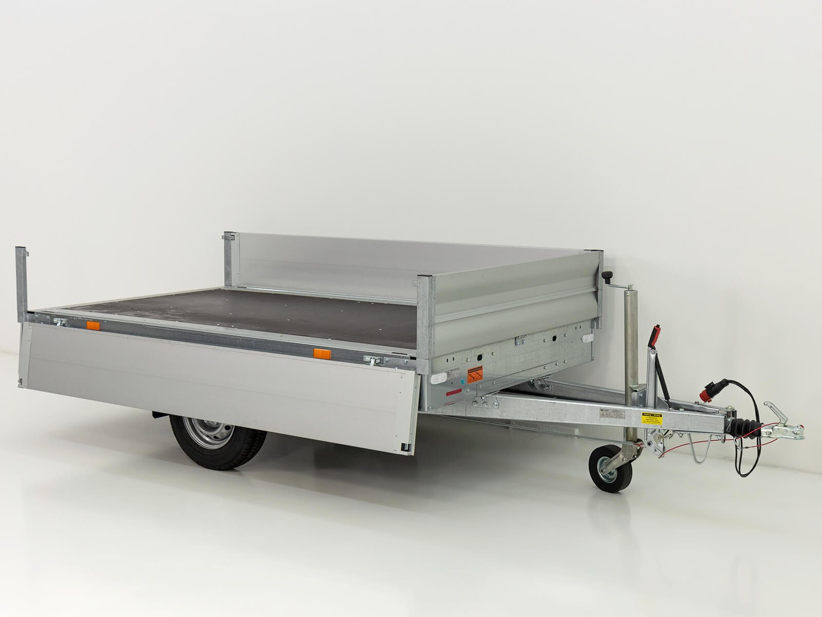 O reboque de carga alta Vezeko DX13.3 é caracterizado por um generoso espaço de carga de 162×317 cm e tem uma carga útil de até 920 kg. A caixa de arrumação por baixo da área de carga e os fechos embutidos nas paredes laterais, que garantem um carregamento fácil e seguro, são particularmente práticos. O trailer possui parede lateral de alumínio com 350 mm de altura, dobrável e removível. O eixo com mola de borracha garante uma utilização isenta de manutenção, enquanto o sistema de reversão automática e a roda de suporte automática tornam o reboque particularmente fácil de usar. O reboque também pode ser equipado para homologação de 100 km/h (disponível como acessório). Ideal para uso comercial ou transportes maiores.